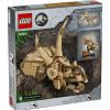 Zestaw LEGO Jurassic World Szkielety dinozaurów: czaszka triceratopsa. Ten model z serii Szkielety dinozaurów zawiera czaszkę triceratopsa z otwieraną szczęką, podstawkę ze skałą, tabliczkę z miejscem wykopalisk z małymi skamieniałościami i narzędziami do wykopalisk, minifigurkę LEGO, tabliczkę z informacjami oraz element „bursztynu” z zatopionym komarem.
