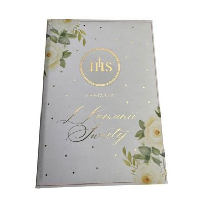 Zapamiętaj każdą ważną chwilę dzięki naszej wyjątkowej książeczce komunijnej! Twardo oprawiona, zdobiona folią hotstamp książeczka zawiera miejsce na wpisanie życzeń oraz wydrukowane sentencje w intencji dziecka przyjmującego Pierwszą Komunię Świętą.