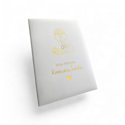 Pamiątka Pierwszej Komunii Świętej - Książeczka Passion Moments Books Premium PMB PR Książeczki PMB Premium to produkt wyjątkowy - pięknie wydany z twardą okładką zdobioną perłową i złotą folią oraz dodatkami takimi jak perły i diamenciki, z kolorowym wnętrzem, pięknymi grafikami i cytatami oraz życzeniami i miejscem na osobistą dedykację. Na wewnętrznej stronie okładki wklejona jest specjalna, nieduża koperta, w której można przekazać kartę podarunkową lub banknot. Książeczka PMB Premium Kukartka to idealny prezent na wyjątkową okazję, jaką niewątpliwie jest Pierwsza Komunia Święta. Cechy szczególne:zdobienie: złota oraz perłowa folia lub welur oraz dodatki takie jak perły i diamenciki wnętrze: kolorowe, z grafikami, cytaty, miejsce na dedykację i wpisanie miejsca/godziny uroczystości, gratis: koperta na drobny upominek wewnątrz, okazja: komunia, Pierwsza Komunia Święta.