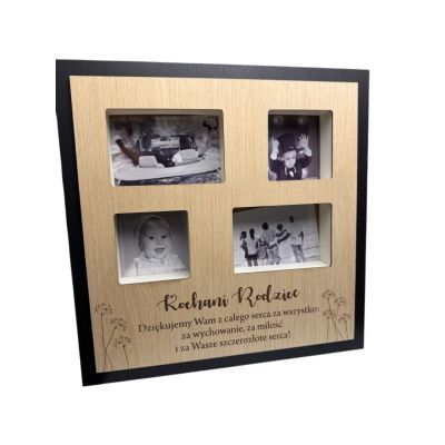 Ramka gigant do zdjęć to wspaniały pomysł, by uwiecznić wspomnienia z Pierwszej Komunii Świętej. Wykonana z solidnej płyty MDF w drewnopodobnej okleinie, wraz z sentencją, posiada 4 miejsca na zdjęcia. Na tylnej ściance ramki są dziurki do zawieszenia na ścianie.Zdobienie: okleina idealnie imitująca drewno, grawer styl: skandynawski, nowoczesny, tradycyjny.