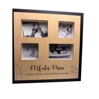 Ramka gigant do zdjęć to wspaniały pomysł, by uwiecznić wspomnienia . Wykonana z solidnej płyty MDF w drewnopodobnej okleinie, wraz z sentencją, posiada 4 miejsca na zdjęcia. Na tylnej ściance ramki są dziurki do zawieszenia na ścianie.Zdobienie: okleina idealnie imitująca drewno, grawer styl: skandynawski, nowoczesny, tradycyjny.